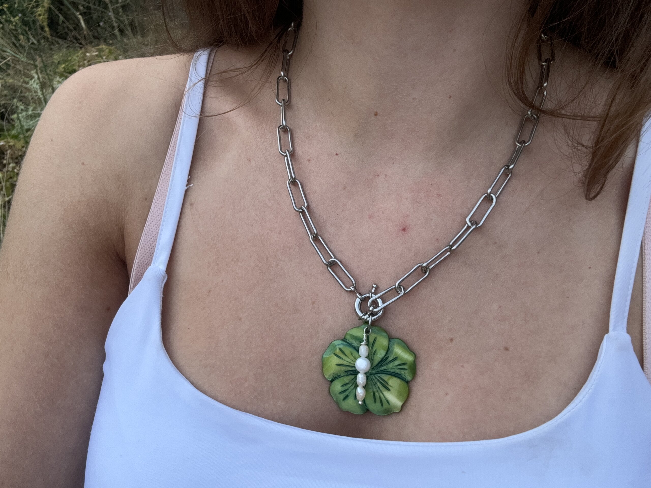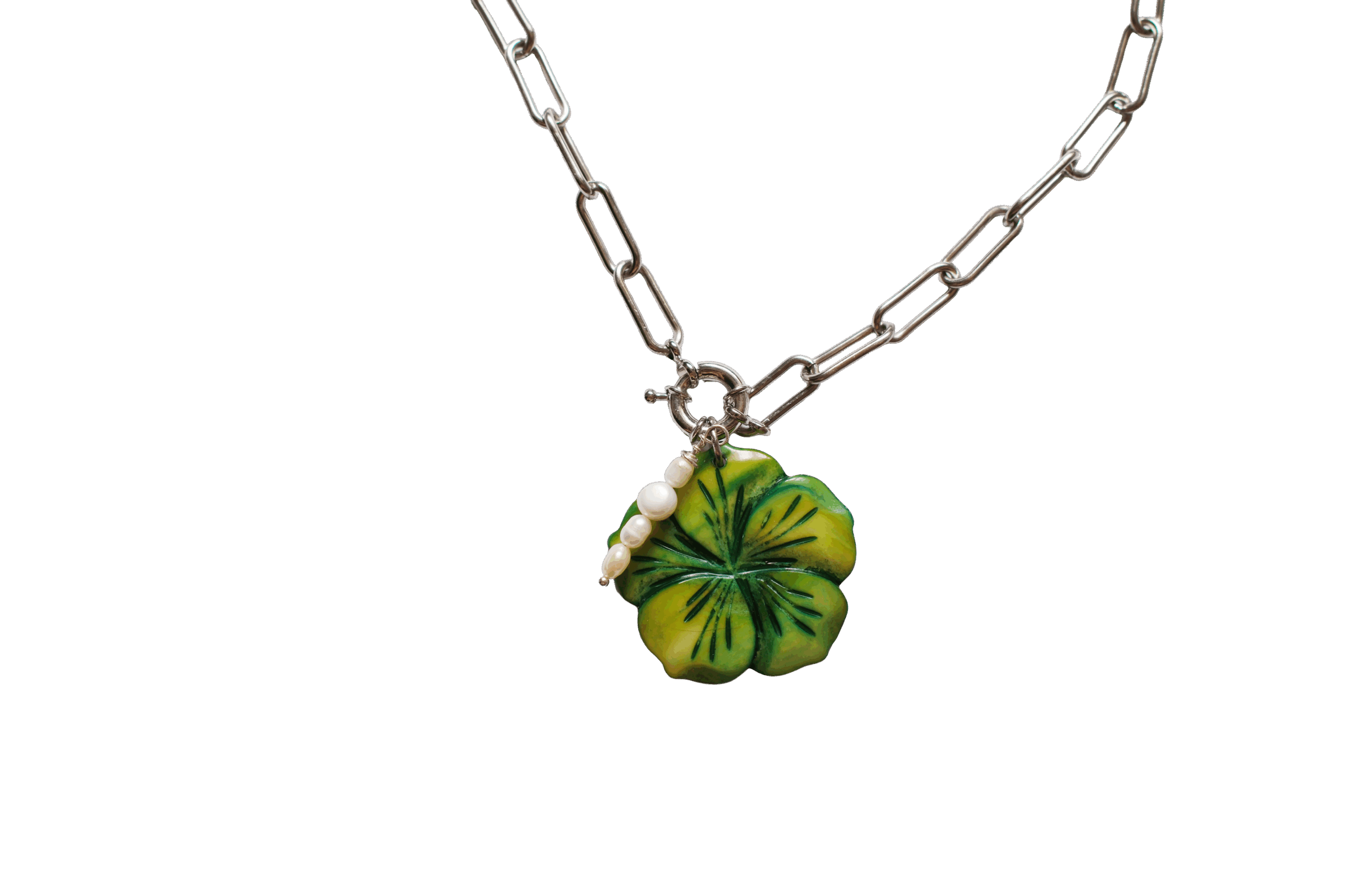 Collares fabricados en cadena de acero inoxidable de alta calidad con colgante de nácar tintado en verde.